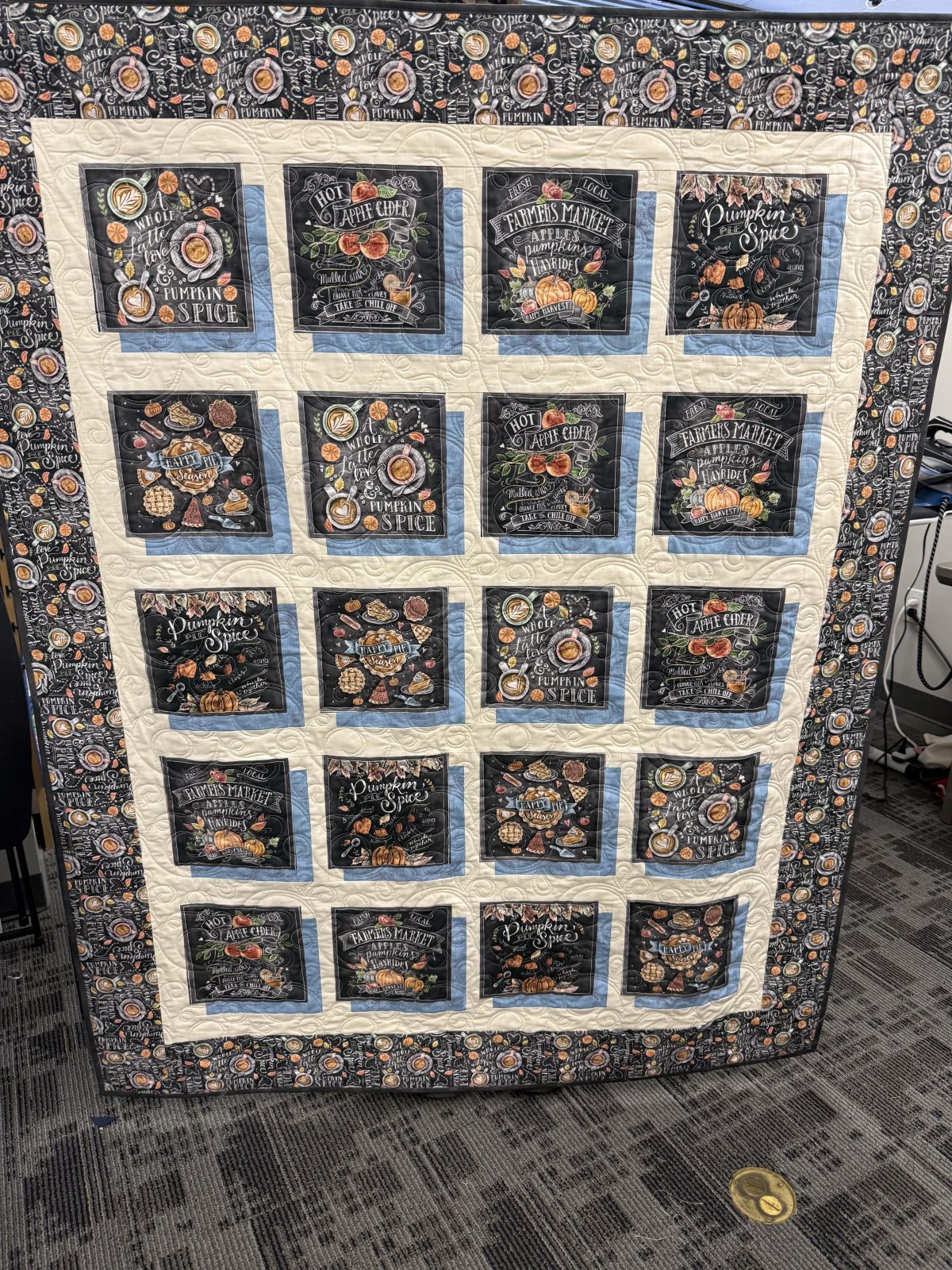 | Requirements: | Sewing Machine and basic supplies, 8.5" small panels or focal fabric (20-24), coordinationg fabric (recommend 1.5 yard for background, .75 yard for "shadow", 1 yard of border fabric and .75 for binding), cutting mat, ruler, and rotary cutter. |